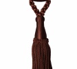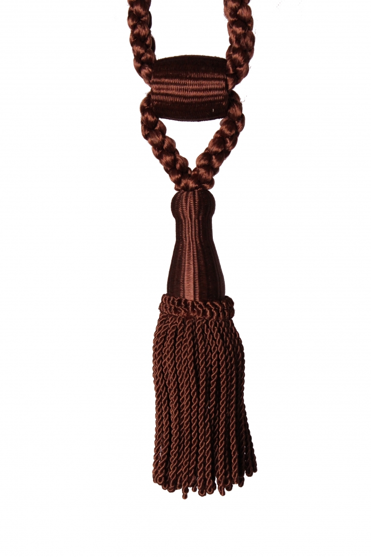 Nieduży, uniwersalny chwost w kolorze brązu z ładnym ozdobnym sznurem i skręcanymi grubymi frędzlami na dole.