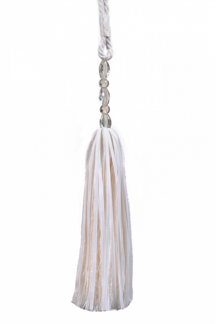 Nowoczesny chwost koralikowy,ozdobiony wstążeczkami. Główka wykonana z podłużnych koralików w kolorze chwosta.Ozdobi ładnie zasłonkę, firankę a także udekoruje krzesło, komodę lub lampę.