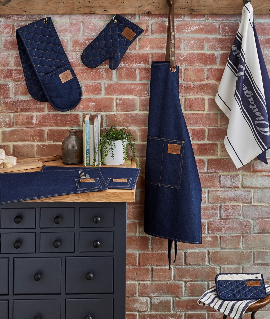 W skład kolekcji wchodzi fartuch kuchenny, rękawica, łapka kuchenna, ściereczki oraz podkładki tekstylne.
