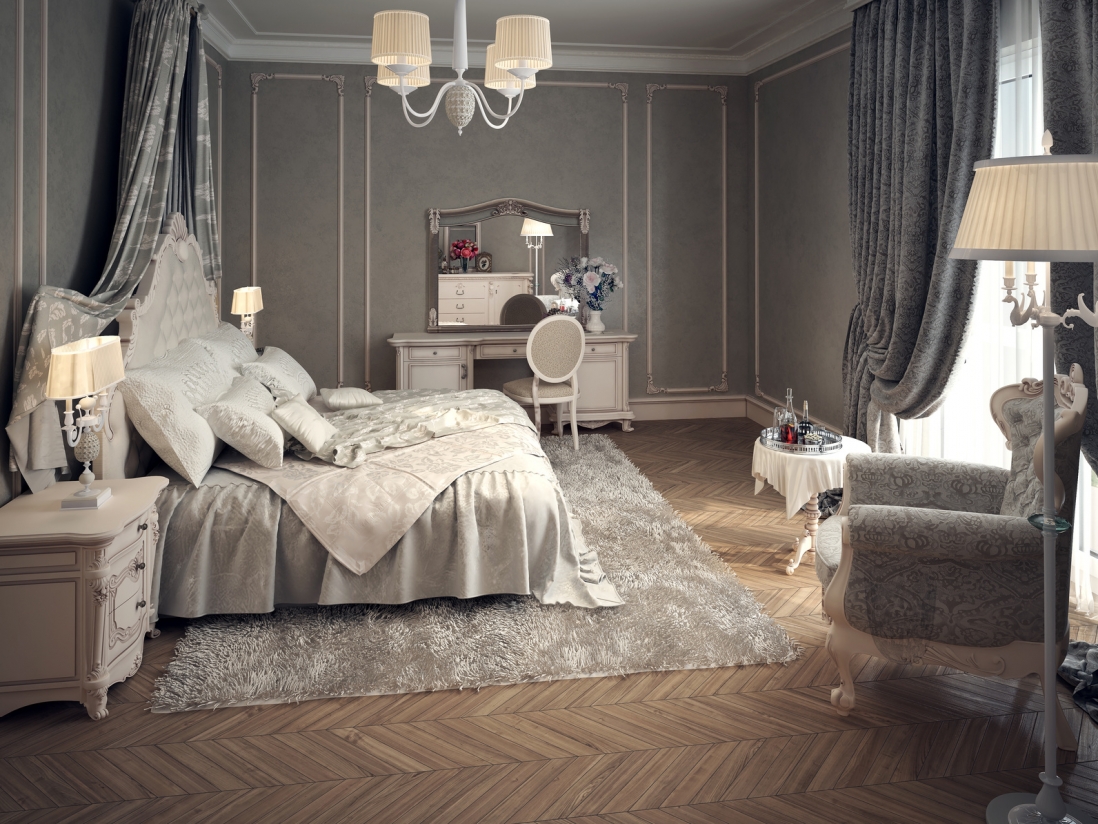 Dominują pastelowe, jasne, subtelne barwy i połyskujące tkaniny. Konieczna jest piękna dekoracja okna z dodatkiem eleganckich chwostów, efektowne poduszki, jasne stylizowane meble oraz sztukateria na suficie lub ścianach.