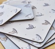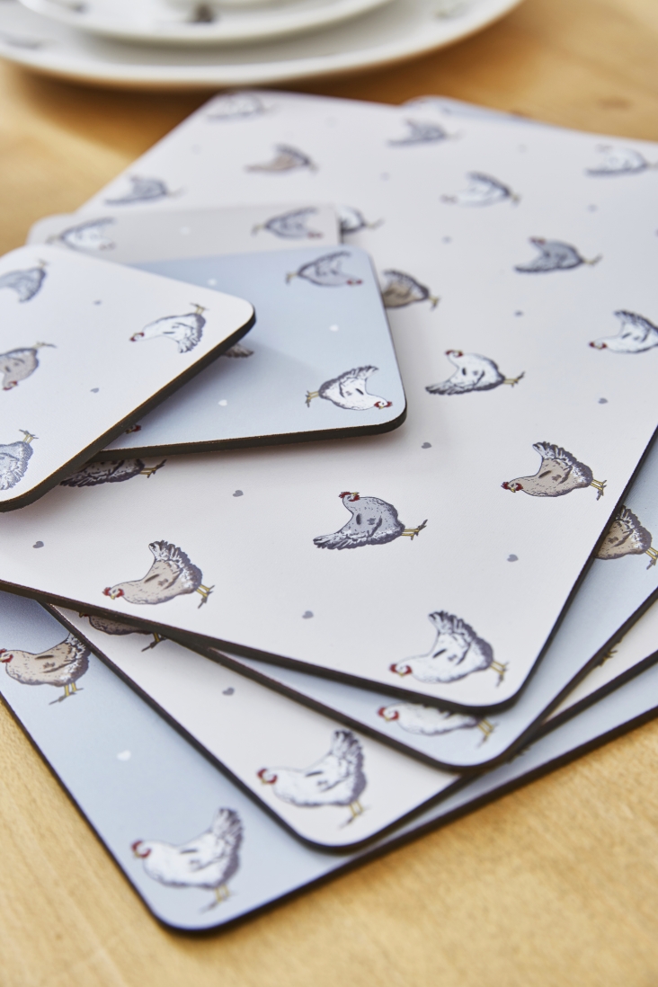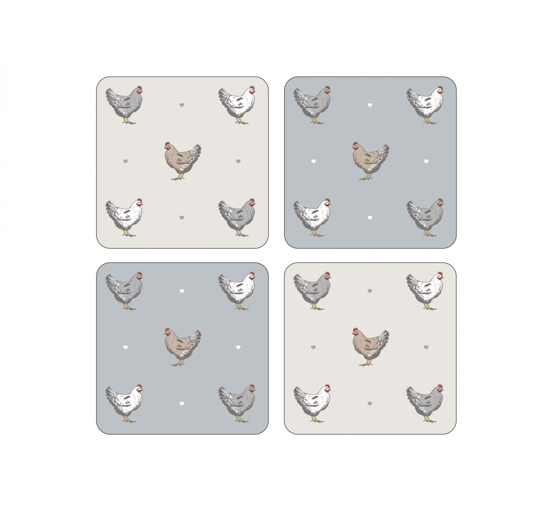 Komplet czterech małych podkładek korkowych pod kubki z nadrukiem powtarzającego się motywu kurek. Dwie podkładki mają tło jasno szare,...