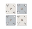 Komplet czterech małych podkładek korkowych pod kubki z nadrukiem powtarzającego się motywu kurek. Dwie podkładki mają tło jasno szare, dwie pozostałe tło kremowe.