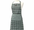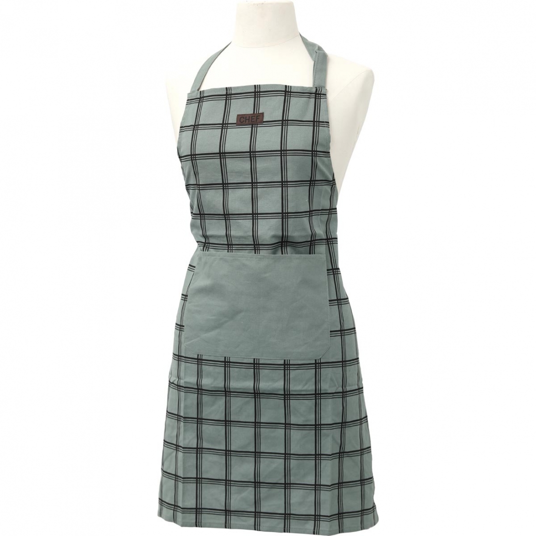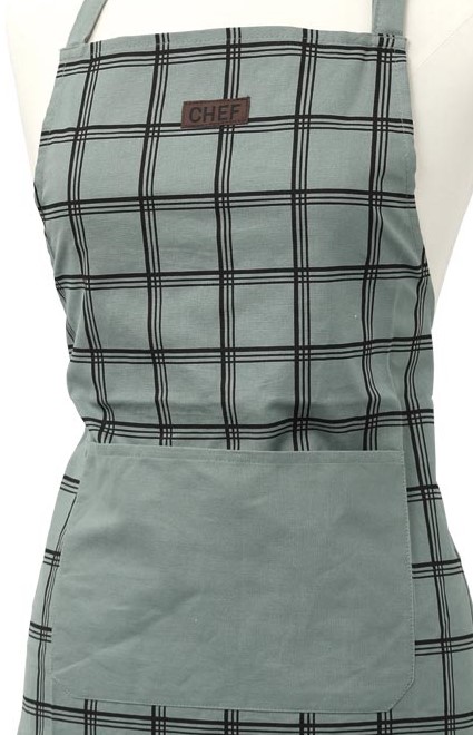 Nowoczesny fartuch kuchenny w kratę wykonany z wysoko gatunkowej miękkiej bawełny  w jasno zielonej tonacji. Wyposażony w gładką kieszeń i ozdobiony naszywką na górze.