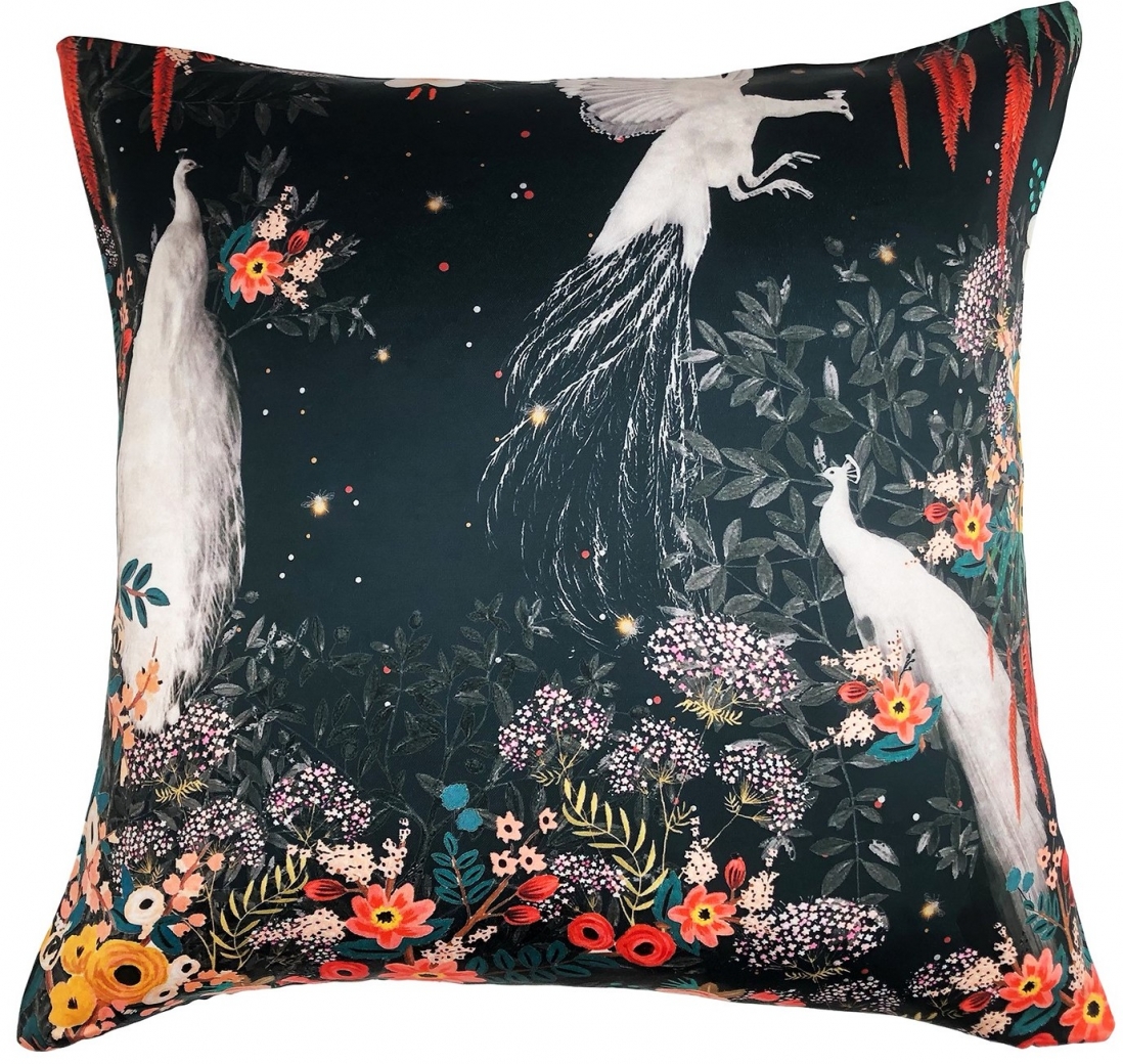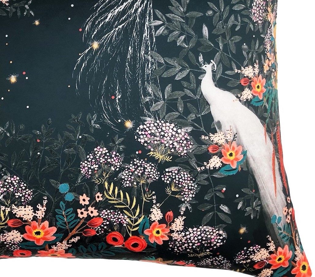 Okazała poszewka w oryginalny motyw białego pawia wśród kolorowych kwiatów.